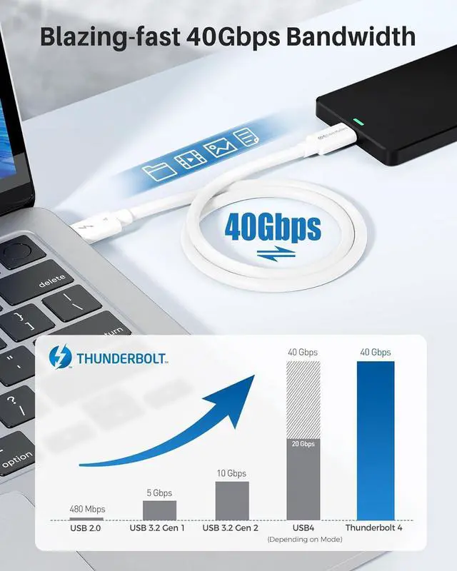 Future-proofed Thunderbolt 4 cable also functions as a USB4 cable, with support for the latest USB4 standard; Connect USB4 devices and transfer up to 40Gbps of data depending on host and device USB4 support; USB-C cable is also fully backward compatible with USB-C 3.2, 3.1, and 2.0 speeds and devices, and supports USB-C features such as DisplayPort Alt Mode (DP Alt Mode) and USB PD. Fully compatible with iPad Pro and MacBook Pro