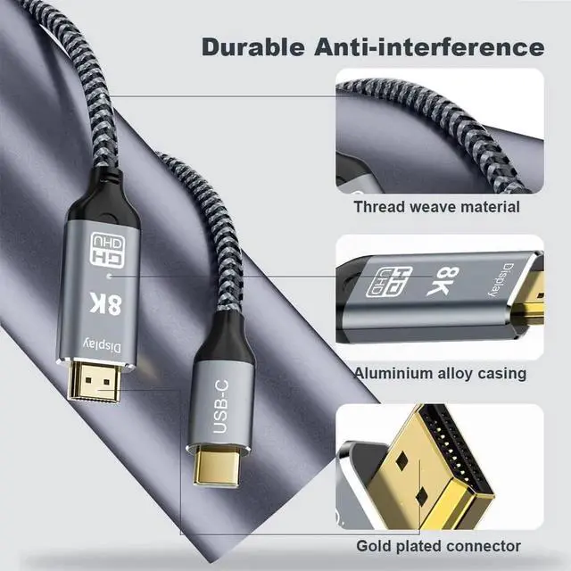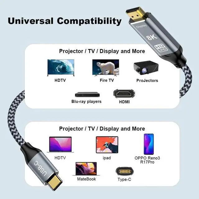 [8K for Future-Proofing]Unidirectional USB C to HDMI 2.1 Cable features the latest HDMI 2.1 standard that supports resolutions up to 8K 60Hz and is backward compatible with 4K 120Hz/60Hz, 2K 240Hz to avoid visual fatigue due to low refresh rates. Expandable/mirrorable to a larger screen for a crystal clear visual experience. Supports Dynamic HDR, HDCP 2.3, 3D, 8K UHD, Dolby Atmos, and more (Note: Mac OS system itself limits support to 4K 60Hz only) *Unidirectional: Only transfers video from USB-C devices to HDMI monitors.