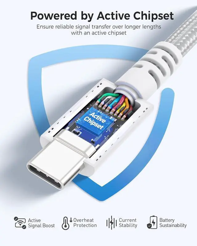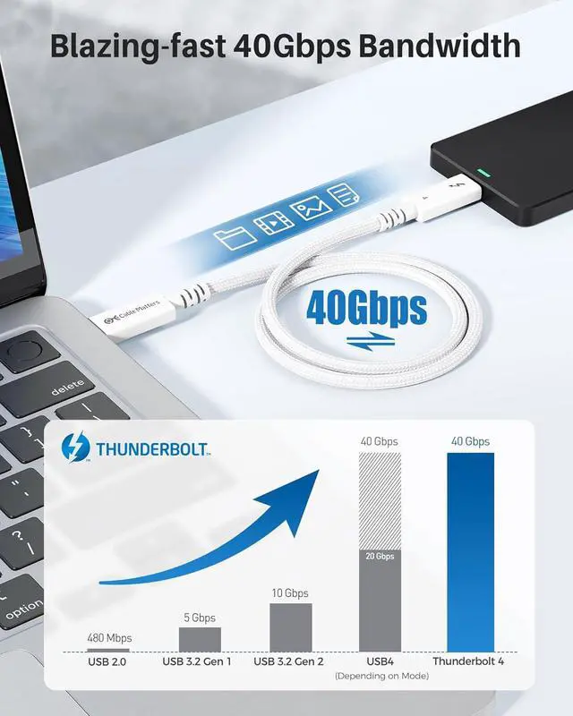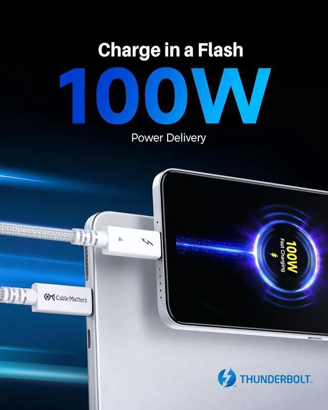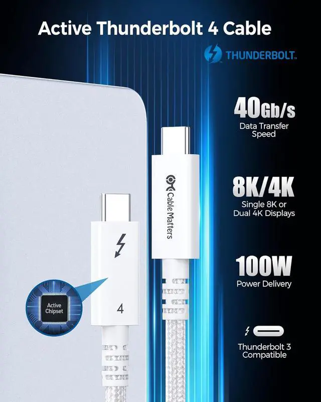 The Cable Matters braided active Thunderbolt 4 cable features the newest Thunderbolt cable and USB 4 cable standards and is a long active cable on the market that does it all; Take advantage of the new Thunderbolt 4 40Gbps connector with this long Thunderbolt 4 cable and USB 4 cable