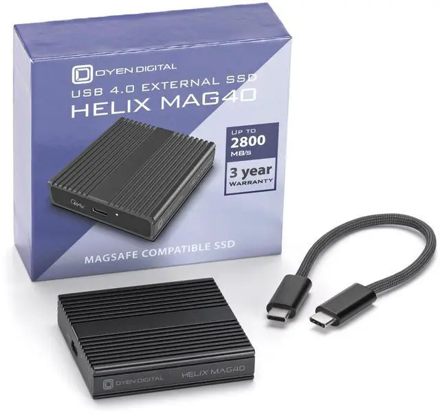 Introducing the Helix Mag40, a USB4 SSD delivering blazing speeds up to 2800MB/sec in a rugged, magnetic aluminum enclosure. Its compact, MagSafe-compatible design snaps securely to your iPhone, providing instant high-speed storage for 4K video capture, photo shoots, and rapid file transfers wherever you are. Helix Mag40 is the perfect choice for creators seeking reliable, ultra-fast external storage that integrates seamlessly into any professional workflow.