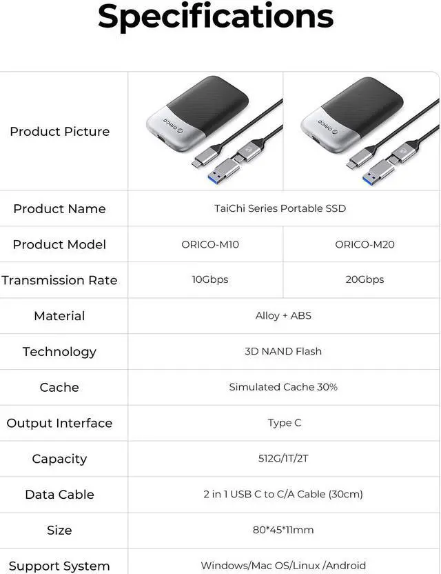 ORICO Taichi Portable SSD 1000MB/S External Solid State Drive 2TBUSB 3.2 Gen2 Type- C PSSD