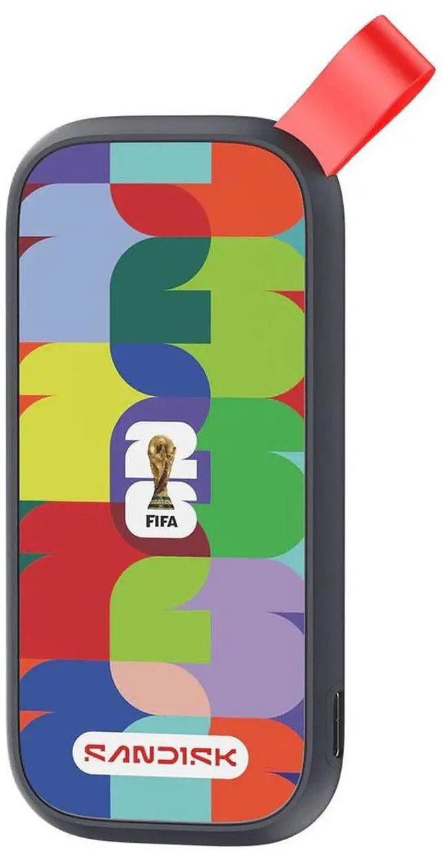 Portable SSD: FIFA World Cup 2026 Edition helps you capture, store, curate, and share heart-stopping moments of what's expected to be one of the most captured, recorded, and shared sports events in history. With fast read speeds up to 800MB/s and a durable design built to travel, this drive is your teammate wherever the FIFA World Cup takes you. Whether you're preserving those spine-tingling match-day memories or creating content on the move, the SANDISK
