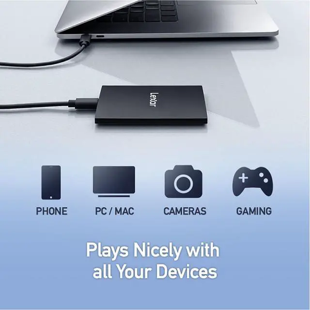 Shoot directly to the drive in up to 4K 60FPS with iPhone 15 Pro and iPhone 15 Pro Max. Plays Nicely with all Your DevicesThe Lexar SL500 Portable SSD is compatible with PC, Mac, Android devices, iPhone 15 series, gaming consoles, cameras, and more. Keep Your Files SecureIncludes Lexar DataShield, with 256-bit AES encryption, to help keep your sensitive files secure. Thermal Control DesignThanks to its unique design, the drive ensures optimal temperatures even at top speeds so performance is always retained.