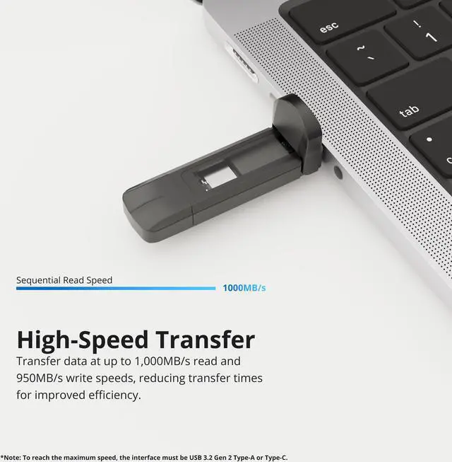 Experience blazing-fast data transfer with USB 3.2 Gen2 technology. Enjoy sequential read speeds up to 1000MB/s making file transfers and backups quicker than ever.