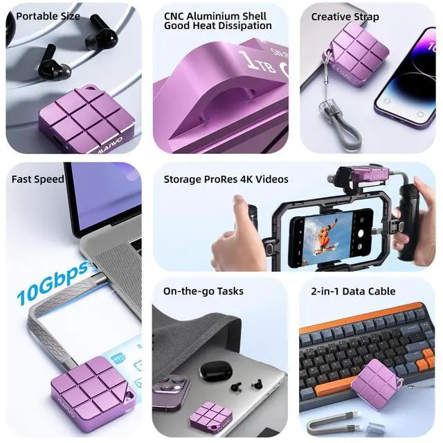 CompatibilityThis portable external SSD is compatible with iPhone 15 Pro and later version via Type-C interface, support recording 4K ProRes videos, perfectly choice for expanding storage space for Macbook Pro/PS4/PS5/Smartphone/Laptop/Tablet/Drone/Gaming Console. It is suitable for Windows/MacOS/Android/Harmony OS/Linux/iOS. Compatible with Thunderbolt 3, Thunderbolt 4, USB 4.0