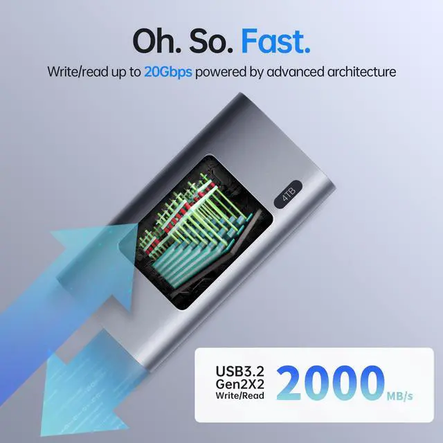 - Fast Transfer: hanks to cutting-edge Ultra chip and premium 3D NAND, this SSD external hard drive ensures an efficient and durable performance. This external ssd remains steady 20Gbps by using high speed SLC caching (25%of the current available capacity is allocated for high speed cache)