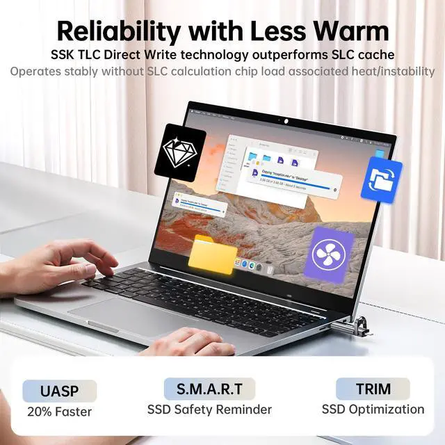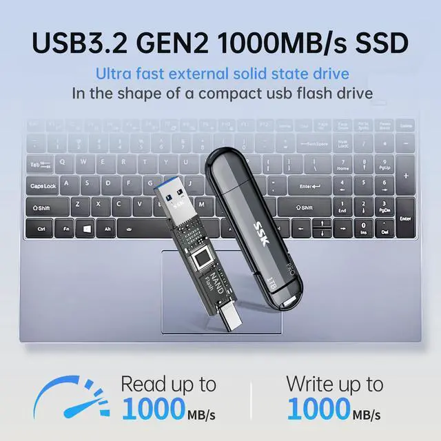 - SSD Level Chip & Zinc Alloy CaseSSK USB C external solid state drive is made of advanced SSD level chip technology and premium zinc alloy shell have excellent shock resistance and fast heat dissipation performance to better protect your data. The usb c ssd portable comes with a keychain leather case for easy portability and storage