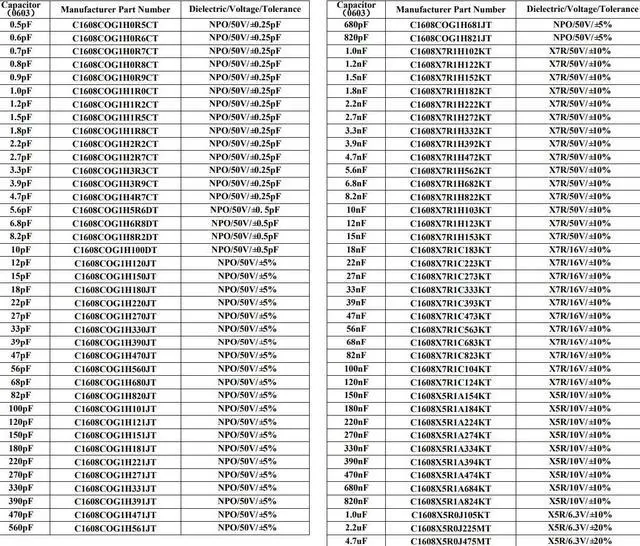 0402 size 70 values, 0.5pF to 1.0uF, ±0.25pF or ±5% to ±10%; 0603 size 79 values, 0.5pF to 4.7uF, ±0.25pF or ±5% to ±20%; 0805 size 83 values, 0.5pF to 22uF, ±0.25pF or ±5% to ±20%; 1206 size 77 values, 1.5pF to 47uF, ±0.25pF or ±5% to ±20%.
