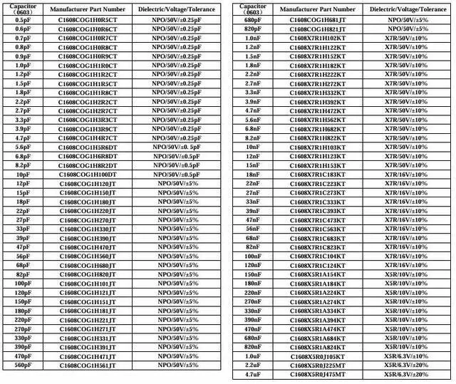 0402 size 70 values, 0.5pF to 1.0uF, ±0.25pF or ±5% to ±10%; 0603 size 79 values, 0.5pF to 4.7uF, ±0.25pF or ±5% to ±20%; 0805 size 83 values, 0.5pF to 22uF, ±0.25pF or ±5% to ±20%; 1206 size 77 values, 1.5pF to 47uF, ±0.25pF or ±5% to ±20%.