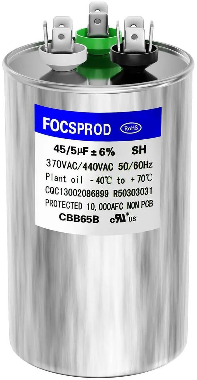 ![Main image of [UL Recognized] FOCSPROD 45+5 uF 45/5 MFD ±6% 370V/440V CBB65B AC Capacitor, Dual Run Round Capacitor Replacement, 45 5 uF 440 Volt HVAC for AC Unit Fan Motor Start or Heat Pump or Condenser Straight](https://c1.neweggimages.com/productimage/nb640/C67GD2604200YGE5W2B.jpg)