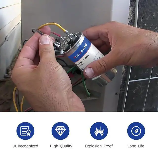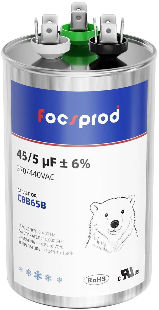 ![Alt view image 5 of 6 - [UL Recognized] FOCSPROD CBB65 45+5 uF Dual Run AC Capacitor, 45/5 MFD ±6% 370V/440V 440 Volt Round Capacitor Replacement, HVAC for AC Unit Fan Motor Start, Heat Pump or Condenser Straight](https://c1.neweggimages.com/productimage/nb640/C67GD2604200YGLQ288.jpg)