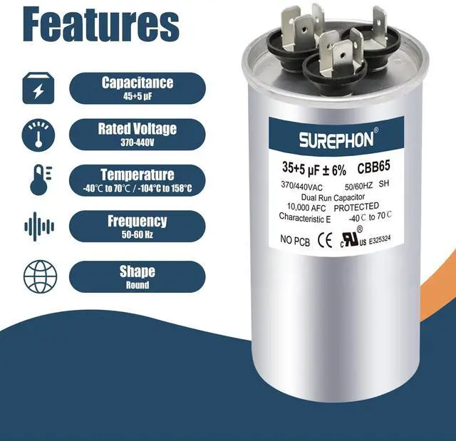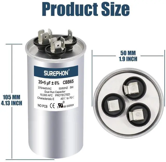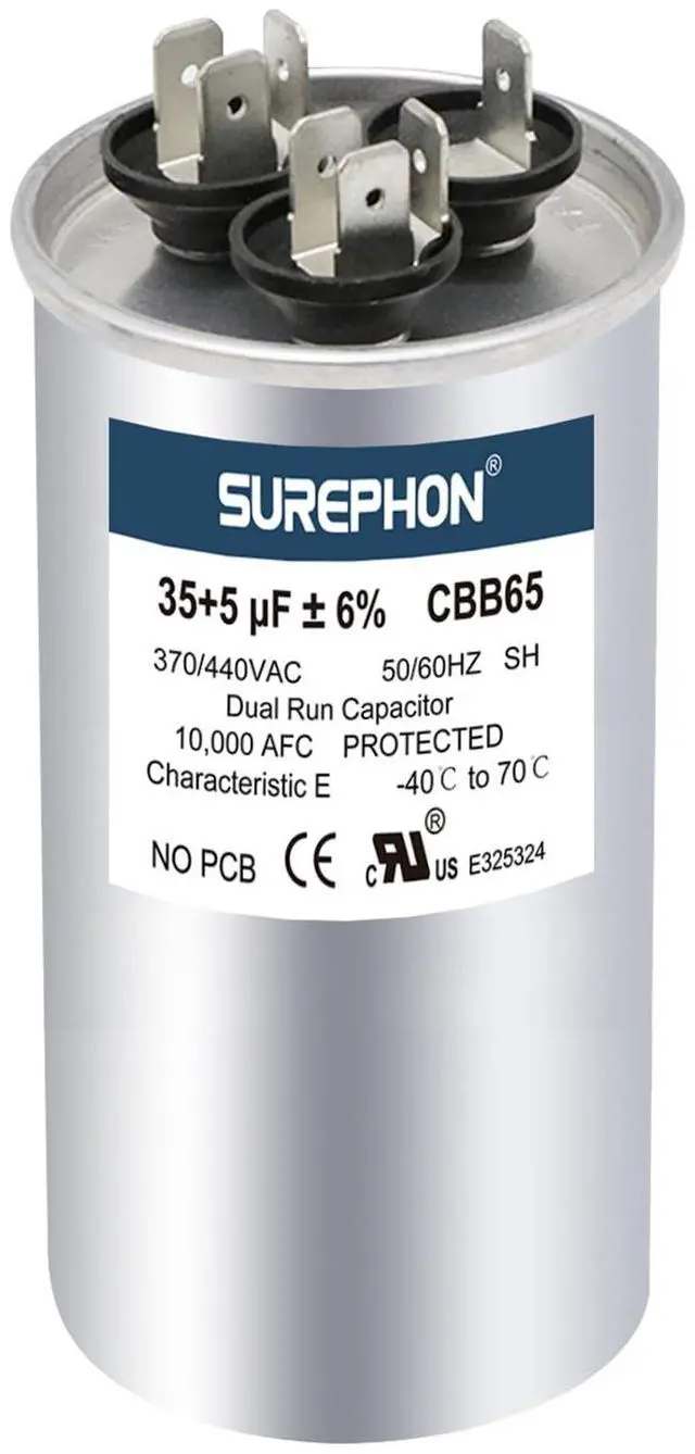 High Performance Capacitor:SUREPHON 35+5 uF ±6% CBB65 oval AC capacitors are perfect replacements for 370V and 440V capacitors for a variety of air conditioning and HVAC applications