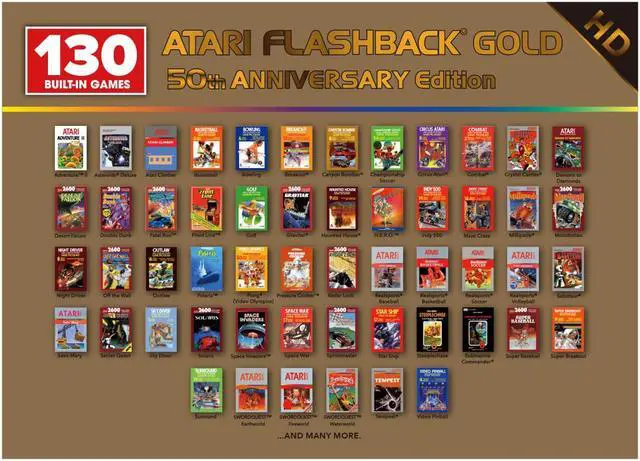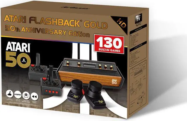 The Atari Flashback Gold HDMI Console 50th Anniversary Edition is a classic game console with 130 built-in games, including Atari 2600 classics like Asteroids, Centipede, Missile Command, Paddle games like Kaboom! and Super Breakout, as well as many other legends like Activision Pitfall and River Raid.