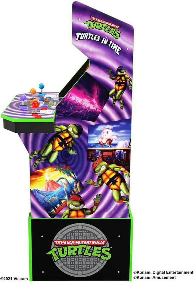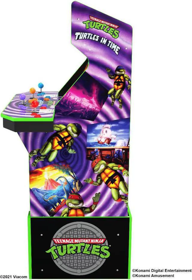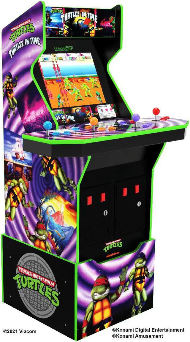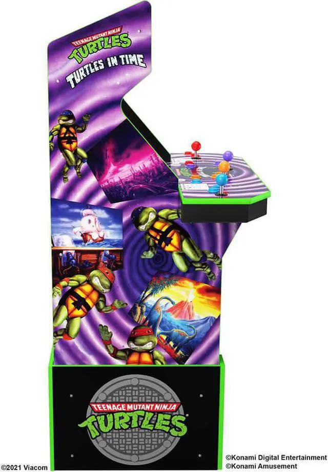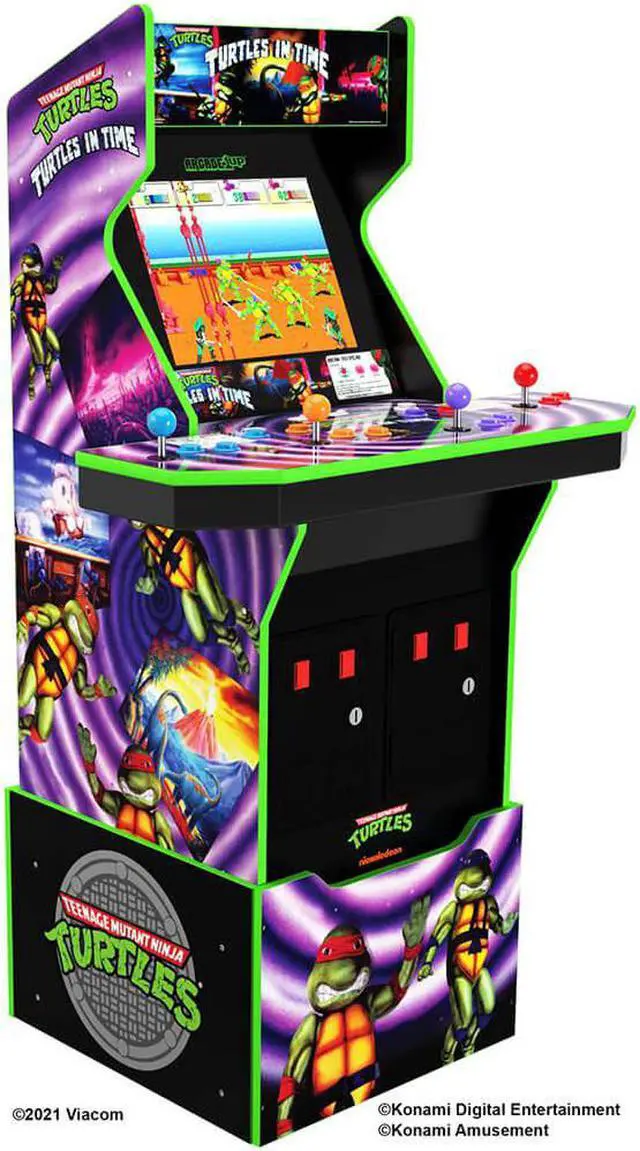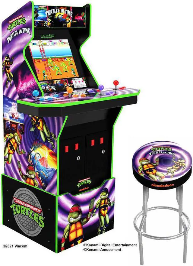 Arcade1UP Turtles In TimeTurtle say whaaa?! Yes, its Turtles in Time, courtesy of Arcade1Up!Originally released by Konami in 1991, this side-scrollin, ninja weapon-wieldin, beat 'em up was the fan-favorite sequel to 1989s Teenage Mutant Ninja Turtles arcade game.Now, three decades later, Arcade1Up is thrilled to make available Turtles in Time in a home arcade machine form factor. (And yep, the original Teenage Mutant Ninja Turtles game is included as well!)Redefining family game rooms, game caves, and even home offices, Arcade1Up arcade machines have quickly become absolute must-haves for retrogame enthusiasts and pop-culture collectors; they play great, look great, and are instant conversation pieces.Cowabunga! Turtles in Time plays exactly how it did in the early 90s. Take control of Leonardo, Michelangelo, Donatello, or Raphael with up to four simultaneous players, making for endless animation inspired fun.Ready to team up for some remote play? The Turtles in Time home arcade game is equipped with Live WIFI; yes, you can fight your way through each level with the help of fellow retrogamers playing from their own machine!Beautifully bold cabinet artwork (with a matching riser!), stunningly vibrant graphics, a light-up marquee, light-up deck protector, and an included exclusive stool that would make Master Splinter proud. Its time to add some Turtles to your life, with this home arcade cabinet from Arcade1Up!