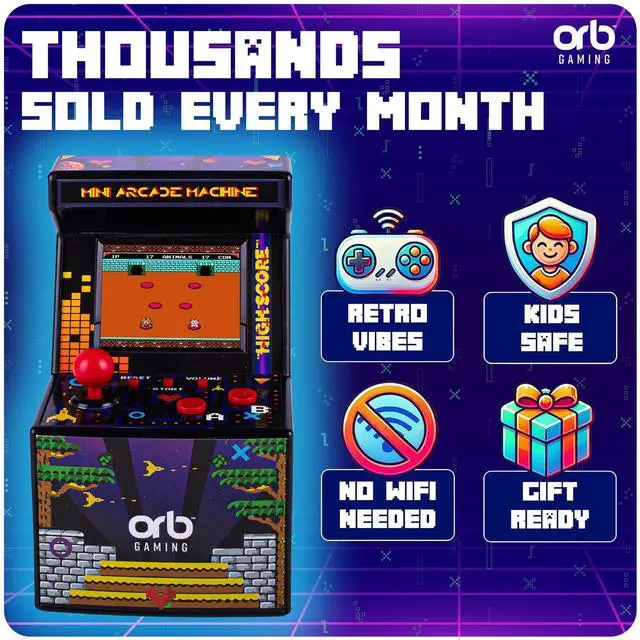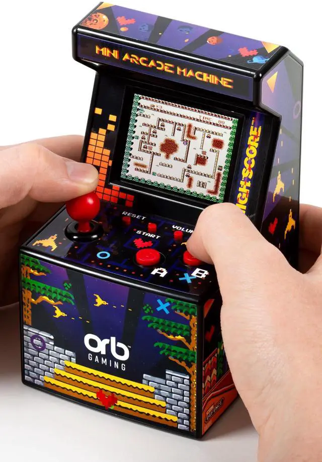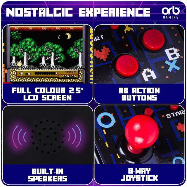 Orb - Mini Arcade Machine, 300 in-Built Games, 8-Bit Retro Arcade Games, 2.5 Full Colour Screen, 8-Way Joystick, 2 Buttons, Volume Control