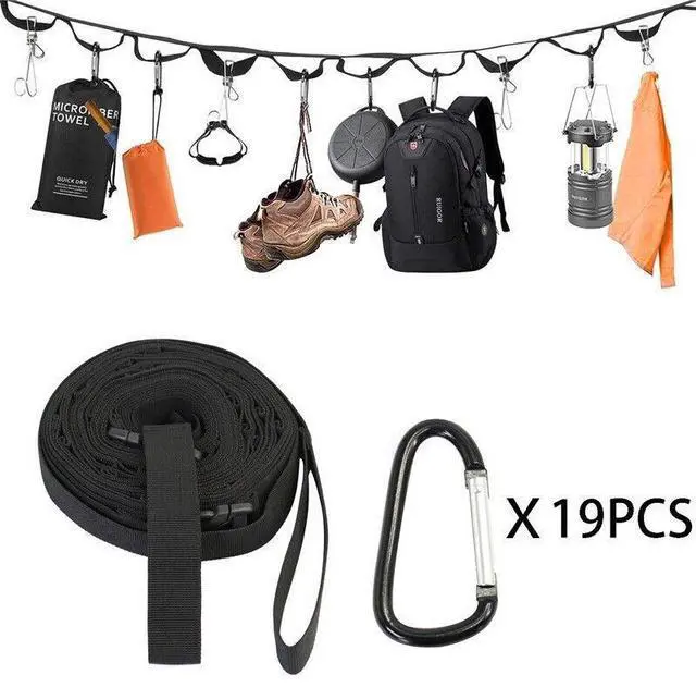 Camping Clothesline Lanyard - 19-Ring Windproof Hanger with Carabiner