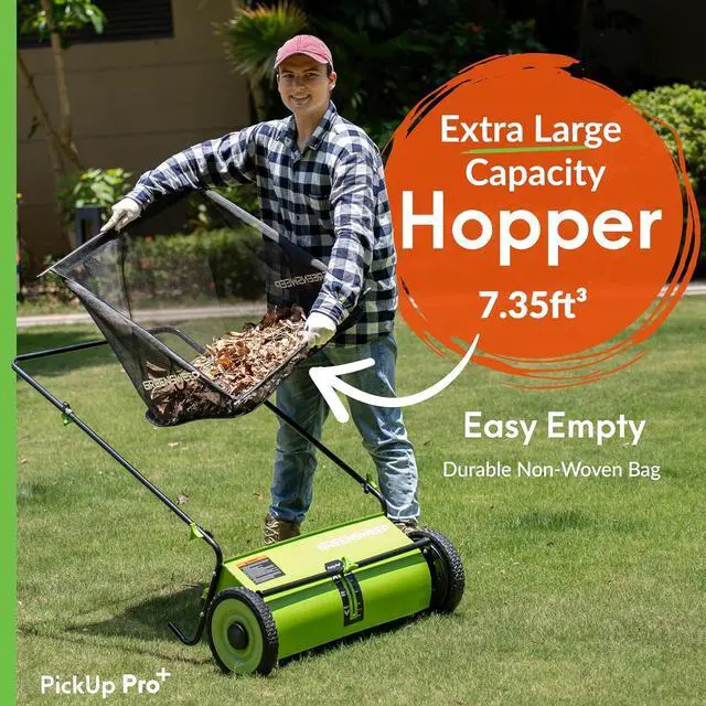 Maintain a pristine lawn with the GreenSweep Pickup Pro Max Manual Garden Sweeper, expertly engineered for efficient collection of leaves, grass clippings, and light garden debris. This push-powered sweeper features robust rotating brushes that lift debris into a spacious 3.5ft3 hopper, minimizing interruptions for emptying. Its tool-free height adjustment allows for seamless adaptation to various grass lengths, ensuring optimal performance across different lawn conditions. Weighing just 14 lbs, the sweeper is easy to maneuver, while the foam-padded, adjustable handle enhances user comfort during extended use. Compact and lightweight, it is simple to store when not in use.