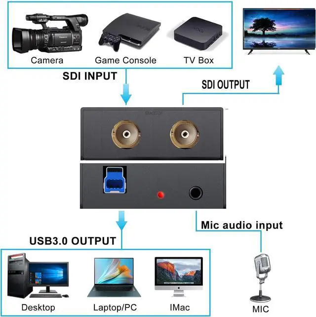 SDI capture card doesn't need to install a driver, and it is PnP, Support MIC input with SDI Loop