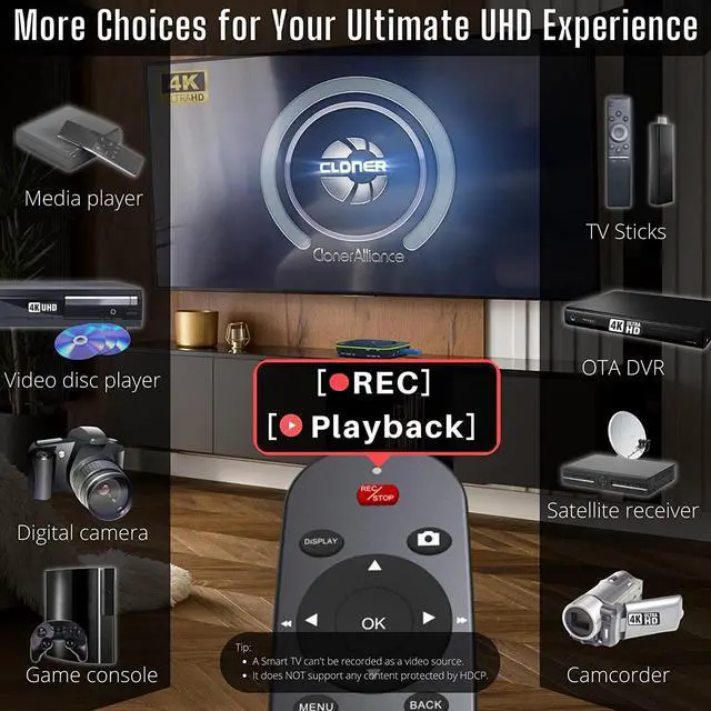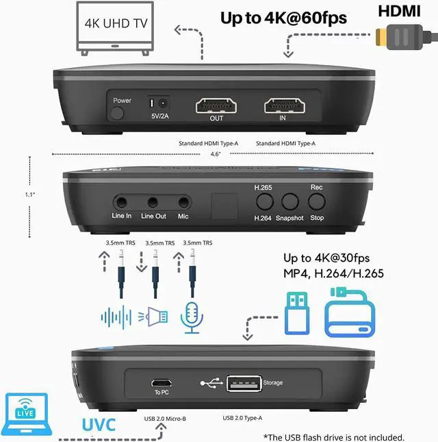 What can it do? - Standalone 4K Ultra-HD digital video recorder with HDMI capture. Record UHD video to a USB storage device with Cinematic-FPS 4K@24fps(Up to 4K@30fps). H. 264/H. 265 codec. Playback the recorded 4K UHD video on a TV with the included remote, No PC required at all. Gaming capture and live are also available if you prefer using a PC.