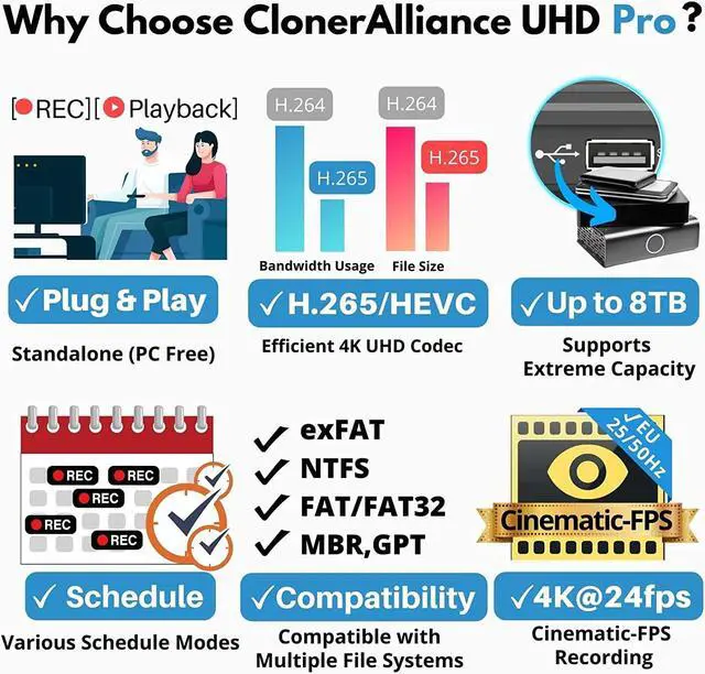 Why choose it over other similar products? - Friendly to use by newbies or older adults. Both H. 264 and H. 265 codecs are supported. Recorded MP4 files can be saved on various file systems(exFAT, NTFS, FAT/FAT32, MBR, GPT). Ultra-low latency (less than 90ms). Various schedule tasks. Cinematic-FPS recording.