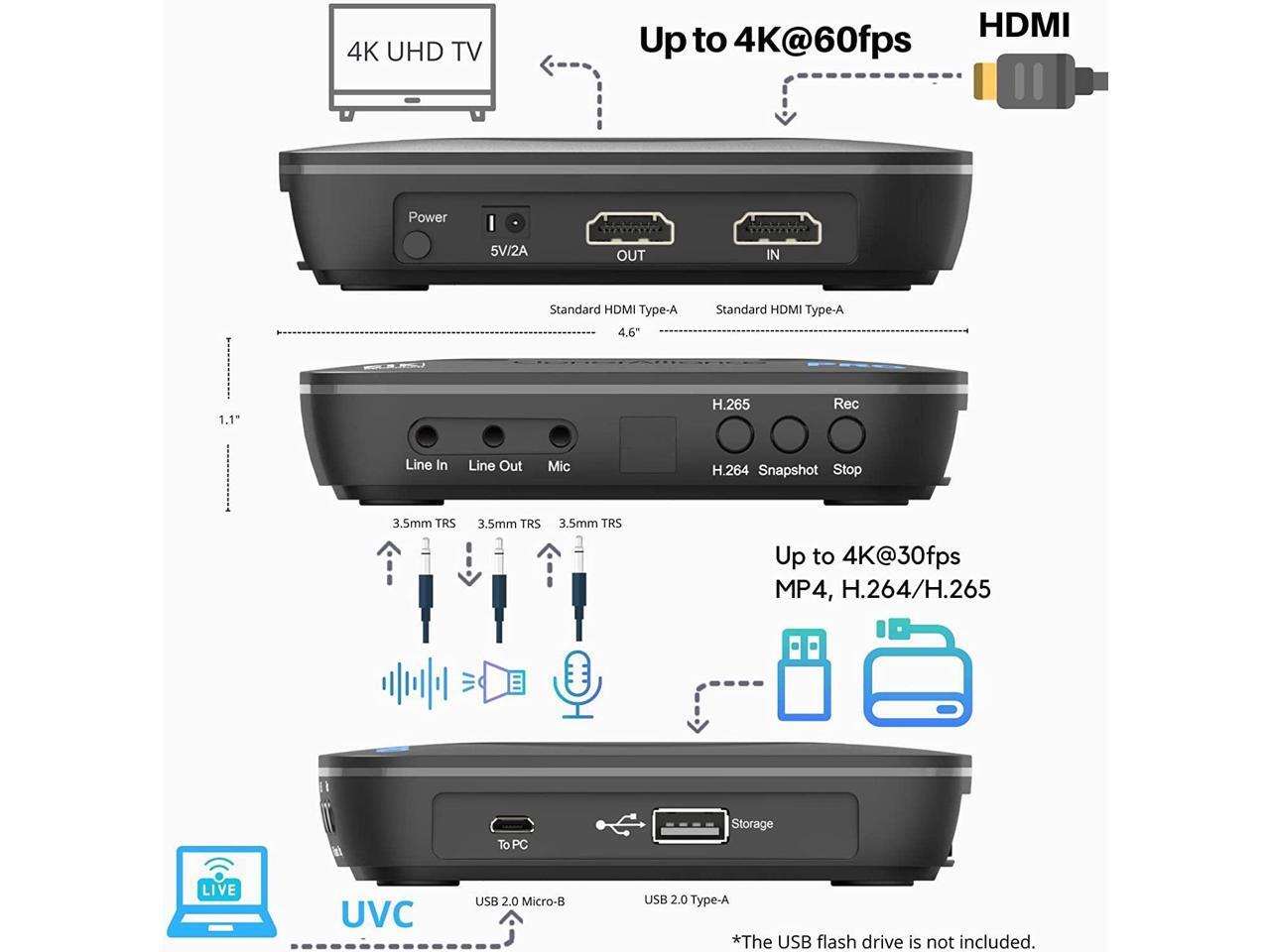 - What can it do? - Standalone 4K Ultra-HD digital video recorder with HDMI capture. Record UHD video to a USB storage device with Cinematic-FPS 4K@24fps(Up to 4K@30fps). H.264/H.265 codec. Playback the recorded 4K UHD video on a TV with the included remote, No PC required at all. Gaming capture and live are also available if you prefer using a PC.