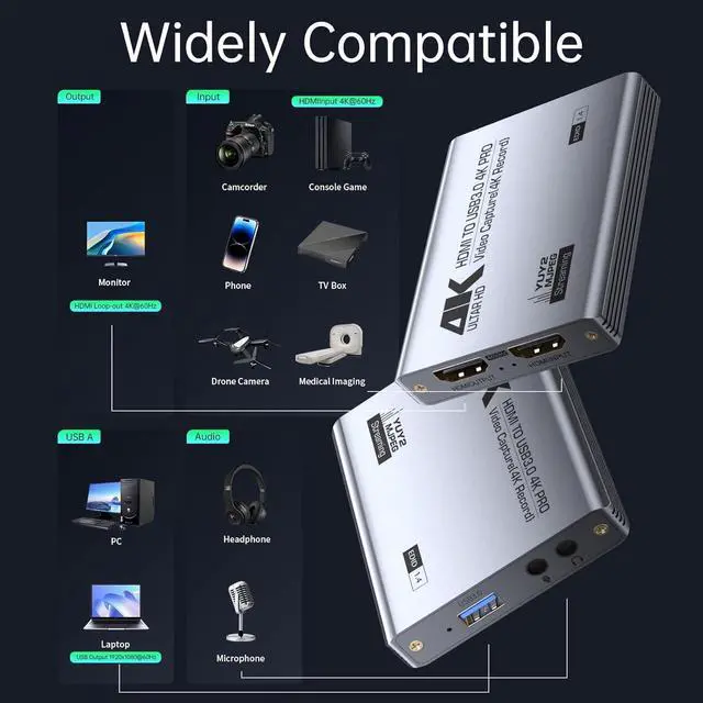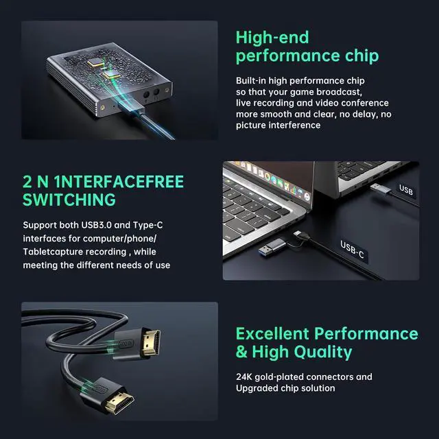 Strong stability and ultra-low latency: the HDMI capture card is made of high-quality aluminum alloy with strong heat dissipation and cable layout design for higher stability and clearer picture quality to avoid blue screen and lag. This HDMI to USB A/USB C capture card supports easy recording of high-quality audio or HD video and transfer it to your computer or streaming platform, allowing you to record 60 fps HD video directly on your hard disk and preview it in real time!