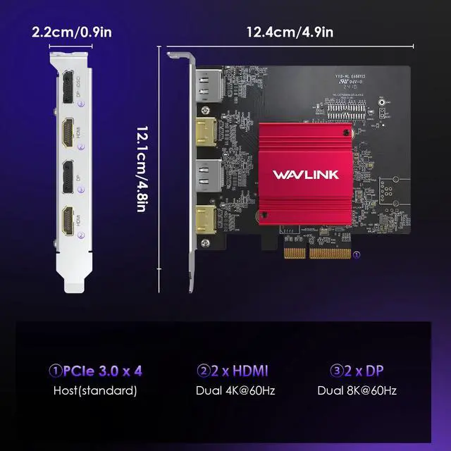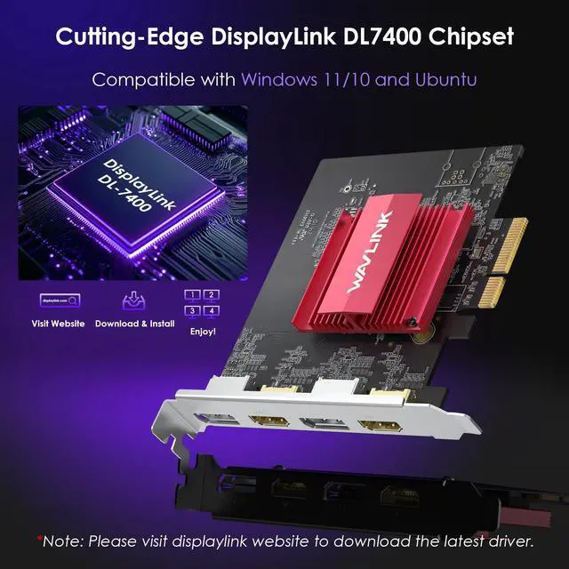 Empower your workspace with a dynamic PCIe 3.0 x4 graphics card. Featuring DP/HDMI ports for stunning 8K/4K visuals, fueled by the cutting-edge DisplayLink DL7400-N chipset. Seamless performance for work and entertainment tasks like document editing and video conferencing. Customize your display effortlessly with mirror and extend modes. Setup is a breezedownload the driver from the DisplayLink website. Compatible with Windows 11/10, Ubuntu and most desktops with a standard PCIe x4/x8/x16 slot. Choose the WAVLINK WL-UG7500DH to elevate your productivity and visual experience!