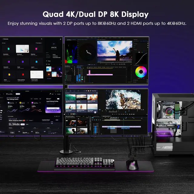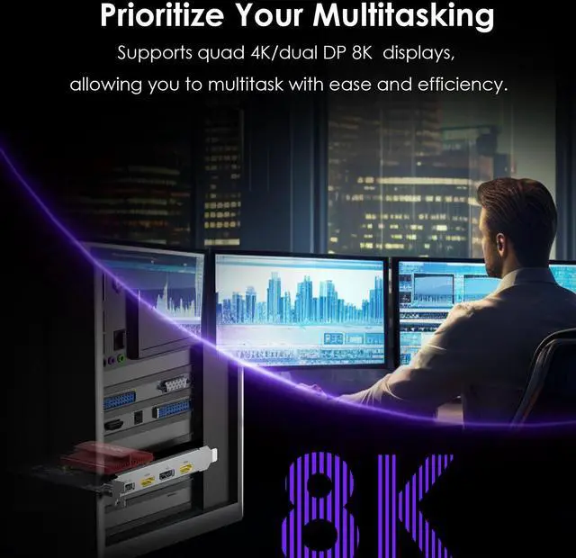 - Two DP support dual 8K, and two HDMI support dual 4K. Quad 4K display.