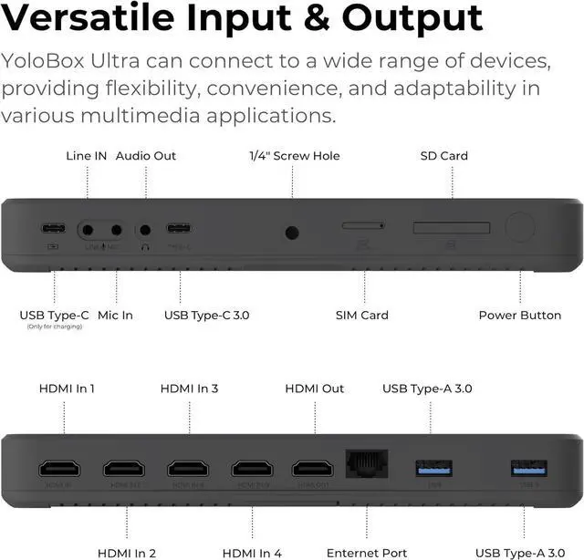 • 4K Live Broadcasting: A 4K HD device that functions as a switcher, monitor, encoder, and recorder, supporting 4G LTE, WiFi, Ethernet, and dual 4G Dongles. Ideal for events like sports, weddings, and church