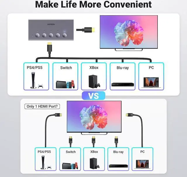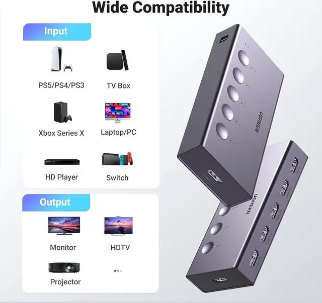 Compatible with Most Devices: UGREEN 4K HDMI splitter is compatible with a wide range of HDMI source devices, including PS5/3/4/4 pro, Blu-ray players, Fire TV stick, Xbox 360, Xbox series x, Nintendo Switch, Apple TV, DVD players, Roku, PC, laptop, HDTV, and projectors