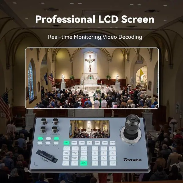 Tenveo NDI PTZ Camera Joystick Controller, 5'' LCD Screen Real-time Preview 4D Joystick Control Keyboard Support NDI PoE VISCA Pelco-D/P RS422/RS485 RS232 RJ45 For Church Live/Events/Live Streaming