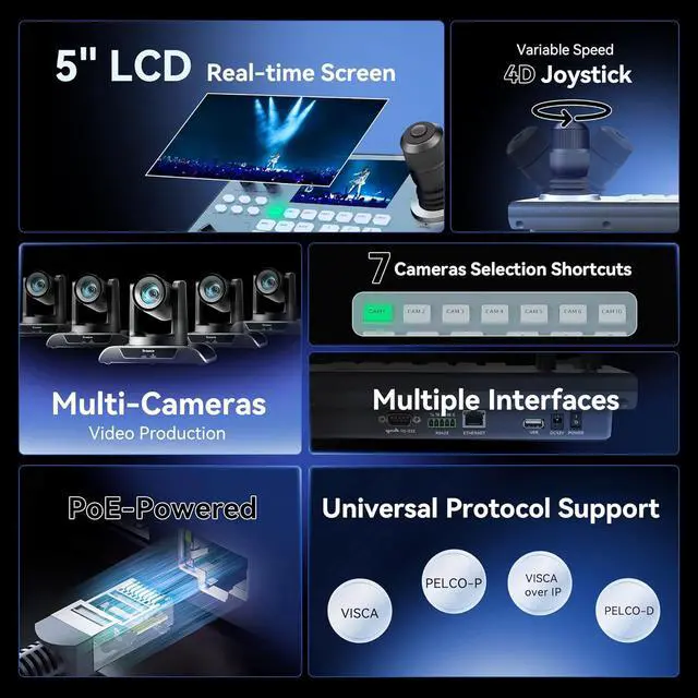 The Tenveo NDI PTZ Camera Joystick Controller features an intuitive 4D joystick and 5'' LCD screen preview, supporting real-time preview of current viewing, allowing you to effortlessly control and adjust your camera angles with utmost precision, resulting in smooth and professional live streaming experiences. You can easily pan, tilt, zoom, focus, Iris, backlight, presets, PTZ Speed, and quick PTZ Camera select according to your needs.
