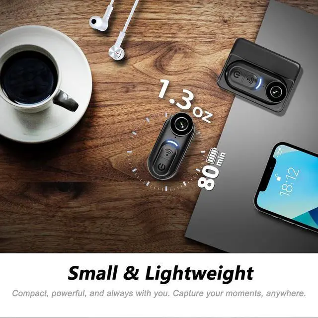 Thumb Size & Hands-FreeExperience ultimate convenience with this incredibly compact, thumb size body camera. Its lightweight, wearable action camera design clips securely to collars, bags, or straps for true hands-free POV camera shooting from your unique perspective.