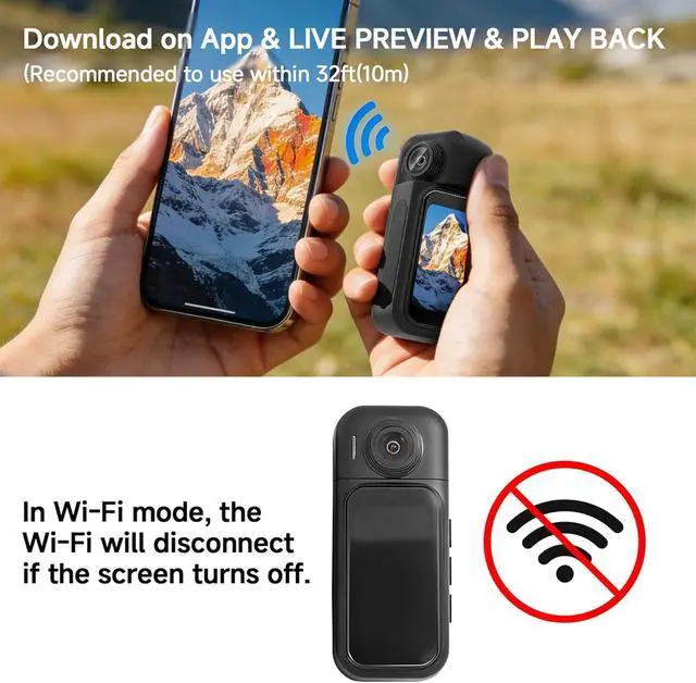 Dual-Mode Smart Control: Switch seamlessly between two perfect workflows. Mode 1 (Direct Record): Power on and press recordno smartphone needed. Ideal for quickly capturing unpredictable moments like pet antics or action sports. Mode 2 (WiFi Connected): Link via WiFi (up to 32ft) for live preview on your phone, precise framing, and instant sharing to social media. Choose pure simplicity or full control; this camera adapts to your pace and creative needs