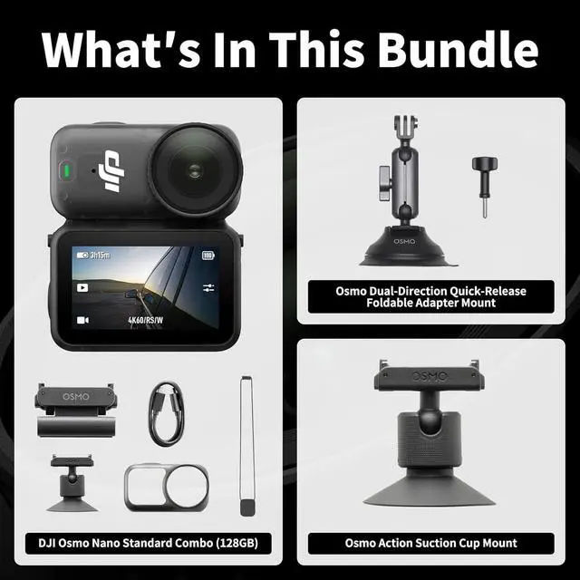 OSMO Nano Vlog Kit (128G), Small 4K/60fps Vlogging Camera with a 1/1.3 Sensor, 143° Wide FOV Video, 200-Min Recording, Swift Content Transfer, Magnetic POV Cam 4K for Sports, Vlog Car Kit