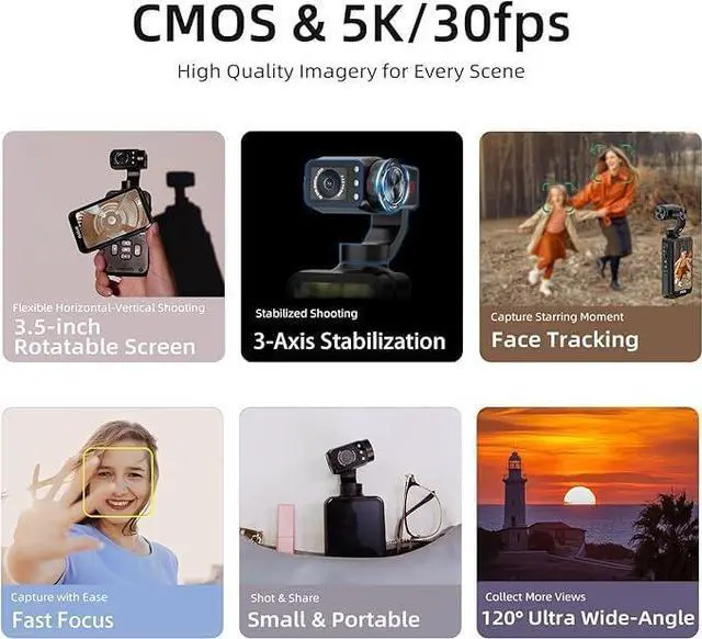 M5 3-Axis Stabilized Pocket Camera, 5K/4K Video, 48MP Still, Night Vision, 3.5" Touch Flip Screen, Face Follow, 1/2.5" Sensor, YouTube Content Creator Kit