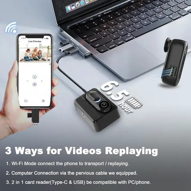 Thumb-Sized & Instant Wi-Fi Sharing Designed for discretion and portability, this body cam is barely larger than your thumb. Use the free app for a fast Wi-Fi connection to instantly preview, edit, and share your videos directly from your smartphone.