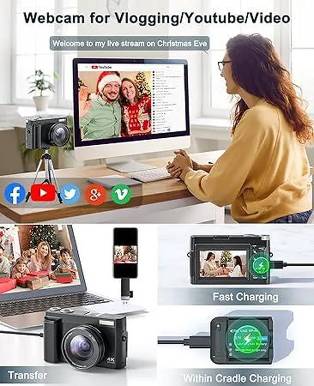 [4K DIGITAL CAMERA FOR VLOGGING] 4K digital camera with anti-shake doesn't miss all details, the vlogging camera's pause helps save editing time, and the time-lapse and slow-motion features create the creativity you want! In addition, 4K vlogging camera for YouTube can as a webcam, letting you easily do live streaming or video calls on YouTube, Facebook or other social media. The digital camera's charger stand can charge the camera and battery at the same time to save you time!