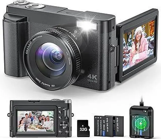 4K Digital Camera for Beginners & Teens, Autofocus 48MP Vlogging Camera for YouTube, 3'' 180°Flip Screen Camera with Flash 16X Zoom, 32G Card Battery Charger Black, Easy to Use