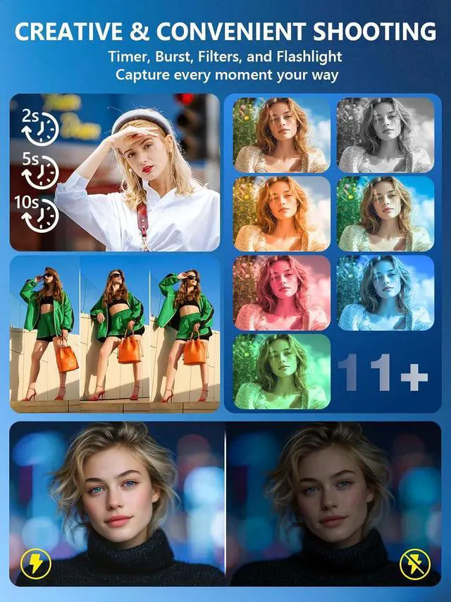 Dual-Lens & Touchscreen ControlEquipped with both front and rear lenses, this cameras for photography makes it easy to switch between selfies, vlogs, and group shots. The built-in anti-shake and fast autofocus help deliver clearer images with less blur. A 3.2-inch HD touchscreen lets you frame your shots smoothly and operate the point and shoot digital camera with ease, perfect for beginners and everyday photography