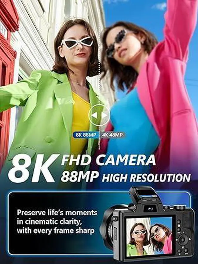 2026 8K UHD 88MP Autofocus Camera2026 upgraded digital camera captures up to 88MP high-resolution photos and records 8K videos with fine detail. The 16x zoom lens makes it easy to switch between broad landscapes and close-up subjects, keeping your travel and daily shots sharp and vivid. With quick autofocus, simply half-press the shutter to lock focus for clearer results