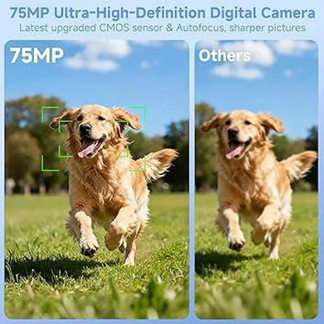75MP & Autofocus Digital Camera: This isn't just a video cameraits an upgraded model that lets you snap stunning 75MP high-resolution photos. The SMARTKLIK photo camera features fast, reliable autofocus to reduce blur and help you capture every beautiful moment with ease. Whether youre a seasoned photographer or just starting out, this point and shoot camera makes it simple to get consistently great shots.