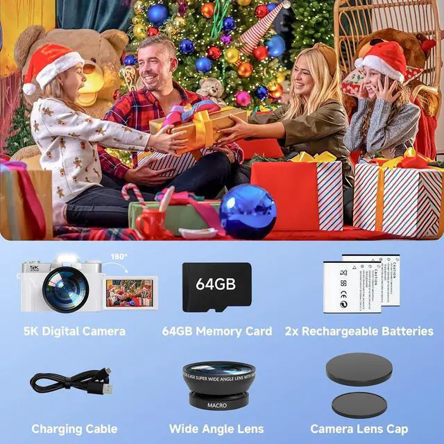 The Perfect Gift for Family & Friends: This versatile digital camera is beginner-friendly and ideal for kids, teens, and anyone looking to capture lifes special moments. Idel for Christmas, Thanksgiving, Halloween, birthdays, anniversaries, graduations. Includes: 1xDigital camera, 64GB TF Card x1 (inside the camera), USB Cable x1, Rechargeable Li-ion Battery x2, Instruction Manual x1, Wide/Macro Angle Camera Lens x1everything you need to start shooting stunning photos and videos right away.