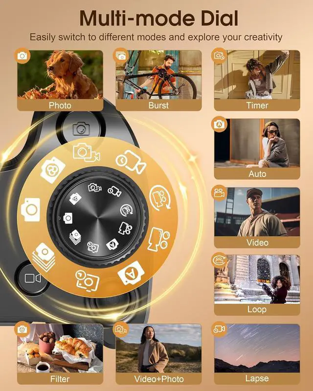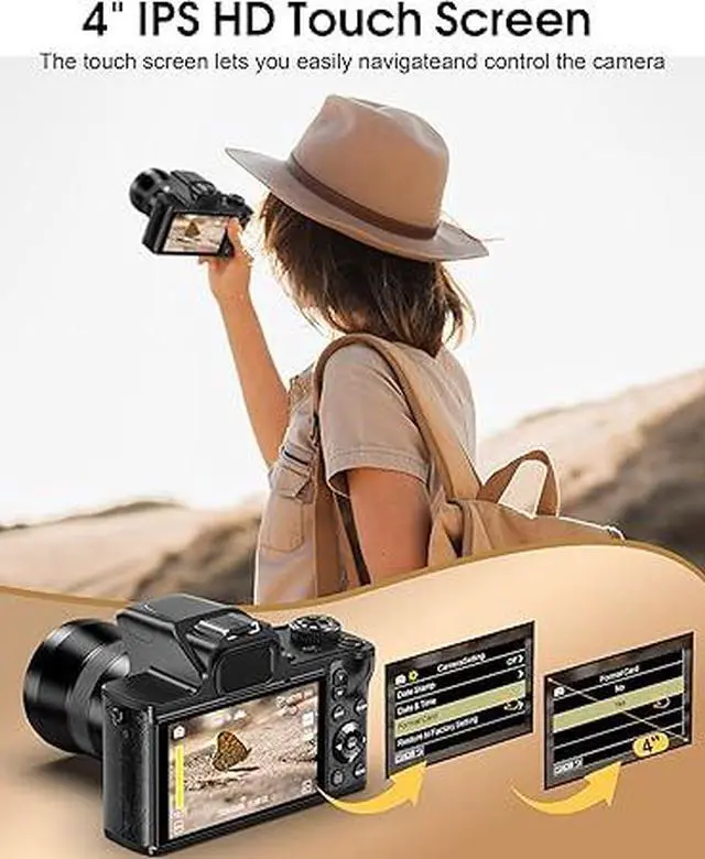 4-inch IPS HD Touchscreen & Mode Dial - The Vlogging cameras 4-inch IPS HD touchscreen offers a more intuitive control experience, delivering vibrant, true-to-life colors for the best visual experience during both shooting and playback. The mode dial allows you to easily switch between shooting modes, making it perfect for both everyday moments and special gatherings