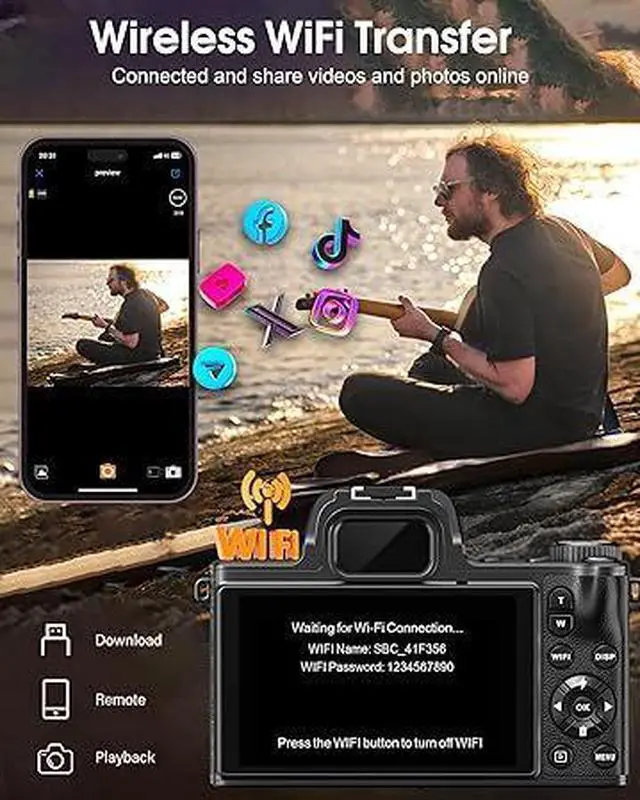 Wireless Wi-Fi & Webcam/Vlogging Function - With built-in Wi-Fi, you can easily connect to smartphone and transfer photos and videos in real-time. When connected to a computer, the camera can also function as an HD webcam for live streaming or video calls on platforms like YouTube, Facebook, or Twitter. The built-in LED flash ensures bright, clear photos even in low-light environments