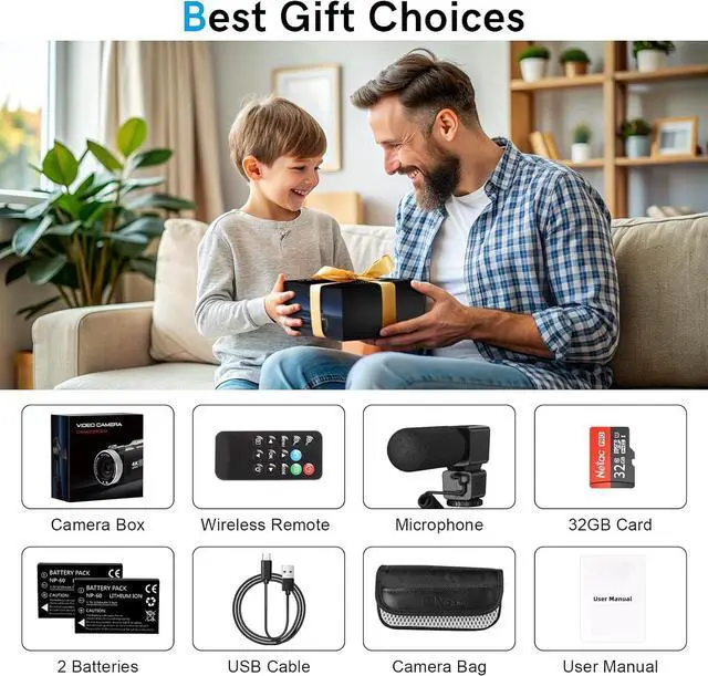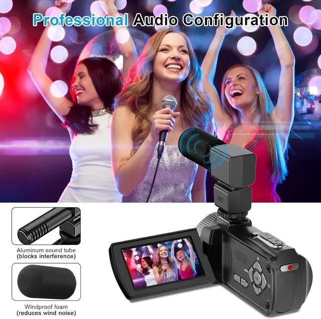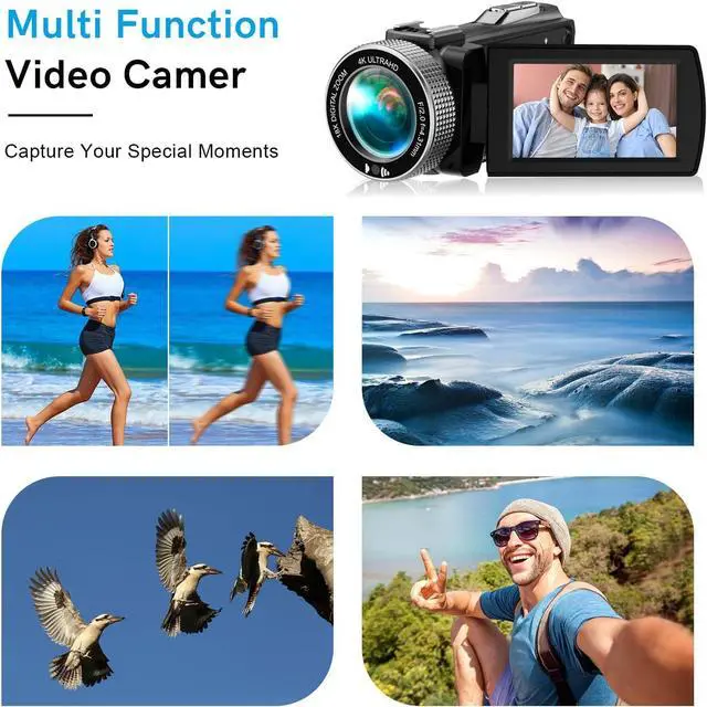 Multifunctional 4K CamcorderThe 4K digital camera includes many powerful features such as slow motion, continuous shooting, time-lapse shooting, loop recording, self-timer, recording while charging, remote control, date stamp, and support for up to a 512GB SD card (The camera comes with a 32GB card). Video camera also supports tripods.