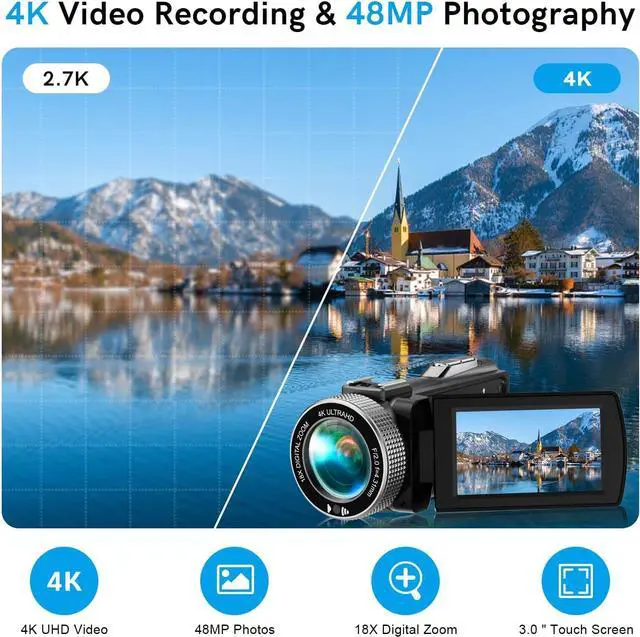 4K FHD & 48MP CameraThis video camera records videos up to 4K resolution and captures 48MP images. The 4K video camera produces clear images and smooth video recordings. The built-in 3-inch touch screen supports 270° rotation and 18X digital zoom, allowing you to capture and record with precision.