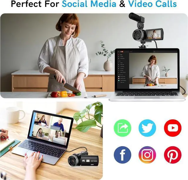 Webcam Function & External MicrophoneThis 4K vlogging camera can be used for live streaming and video calling. Simply connect the 4K camcorder to your computer via the included USB cable and select PC Camera mode to enter webcam mode. The external microphone effectively reduces wind noise and eliminates background noise for clear, crisp audio.