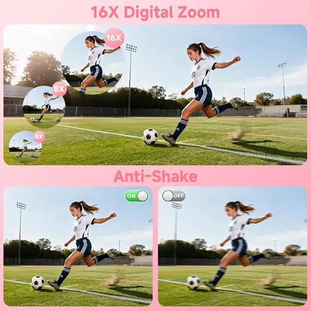 16X Digital Zoom & Anti-Shake: With the easy-to-use W/T button, you can smoothly zoom in or out to capture concerts, music festivals, distant landscapes, wildlife, skiing action, sunsets, and so much more. This small digital camera makes it simple to get close to the moment, and its built-in anti-shake technology helps keep your photos steady, sharp, and beautifully cleareven when youre on the move.
