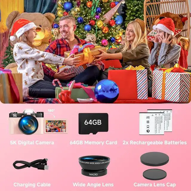 The Perfect Gift for Family & Friends: This versatile digital camera is beginner-friendly and ideal for kids, teens, and anyone looking to capture lifes special moments. Idel for Christmas, Thanksgiving, Halloween, birthdays, anniversaries, graduations. Includes: 1xDigital camera, 64GB TF Card x1 (inside the camera), USB Cable x1, Rechargeable Li-ion Battery x2, Instruction Manual x1, Wide/Macro Angle Camera Lens x1everything you need to start shooting stunning photos and videos right away.